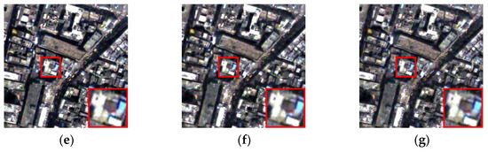 Group 2 image pair in Figure 14 is the degraded data set of WorldView-2 on the urban area, and Figure 17 shows the corresponding fusion results of the compared methods and the proposed method. Figure 17a is the original MS image, which is used as the reference image for evaluation. There is serious spectral distortion in the fused result that was obtained by the IHS method. The color of the fusion result of the NSST-SR method has a certain degree of spectral distortion. The fusion result that was obtained by the MSVD method is blurred. Fusion results yielded by the NSCT-PCNN, PRACS, GSA, MF-HG, and our proposed methods achieve better visual effects and have a more similar appearance to the reference MS image.