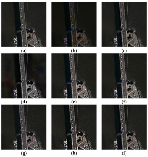 The fusion results of the WorldView-2 data set on the bridge area: (a) reference; (b) IHS; (c) NSCT-PCNN; (d) NSST-SR; (e) MSVD; (f) PRACS; (g) GSA; (h) MF-HG; and, (i) proposed.