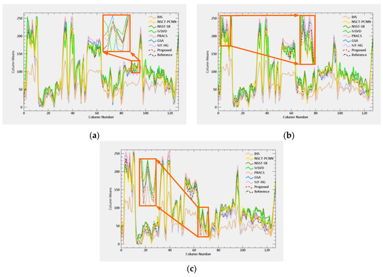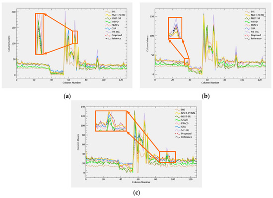 For better analysis of the spectral preservation ability of the fused images in Figure 15, the horizontal profiles of the column means for R, G, and B bands of the fusion images that were obtained by different methods are displayed in Figure 16. The profile that was formed by black dots is the reference image. The closer to this dotted profile, the better the spectral characteristics are preserved. It can be seen that the profile of the IHS method has large deviations from the reference images in most areas. In contrast, the fused image that was obtained by the proposed method is most similar to the horizontal spectral profile of the reference image, and it has the highest fidelity for the spectral information.