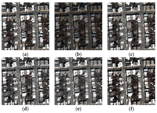 The quantitative evaluation results of Figure 19 are given in Table 12, in which we can see that the proposed method outperforms the six compared methods in most indices, except the index. The best values in and indicate better spectral preservation ability of the proposed method. Values of , and also achieve the optimal value, which demonstrates that the fused image obtained by the proposed method achieves better preservation ability of spatial and spectral information and has the most similar structure to the reference image. The value of our proposed method is close to the optimum, which is given by the PRACS method. According to the subjective visual effect and objective evaluation using the QuickBird data set, our proposed method can harmonize the spectral information preservation and the spatial details injection well, and it is better than the other six state-of-the-art methods.