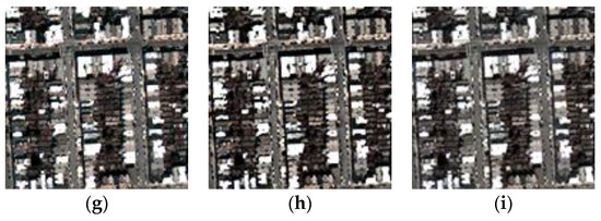 The fusion results of the WorldView-2 data set on the urban area: (a) reference; (b) IHS; (c) NSCT-PCNN; (d) NSST-SR; (e) MSVD; (f) PRACS; (g) GSA; (h) MF-HG; and, (i) proposed.