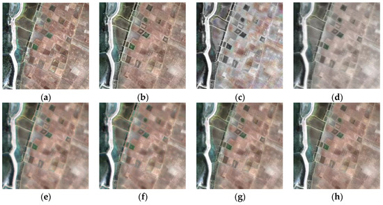 The fusion results of the QuickBird data set: (a) reference; (b) NSCT-PCNN; (c) NSST-SR; (d) MSVD; (e) PRACS; (f) GSA; (g) MF-HG; and, (h) proposed.