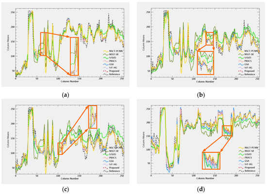 Figure 20 shows the horizontal spectral profiles of the column means for R, G, B, and NIR bands of the fusion images and the reference image. The profiles of the NSST-SR and MSVD methods have large deviations from the reference image. The profiles of the GSA, PRACS, and MF-HG methods agree relatively well with the reference image. It can be seen that the profile that was obtained by our proposed method is the closest to the reference profile.