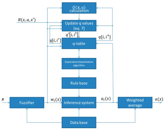 - Update the q values as follows:where and is the choice of the action that has the maximum Q value for the fired rule . The block diagram of a fuzzy Q-learning agent is depicted in Figure 2. Thus, the q values are updated as:
