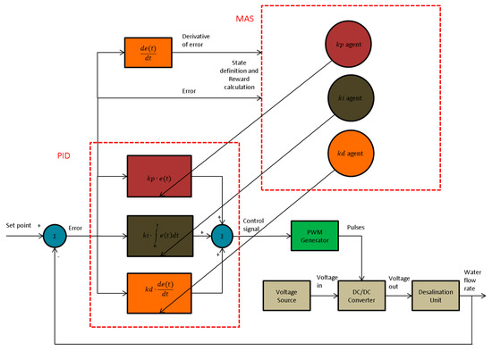 The control strategy of the desalination plant is depicted in Figure 3. The error arose from the subtraction of the set point (desire water flow rate) and the true value of the flow rate. The error signal was the input of the PID controller. The output of the PID controller was the reference voltage of the Pulse Width Modulation (PWM) generator. The PWM generator [47] produced pulses, which drove the switch of the converter. The converter received voltage in the input and, accordingly, the duty cycle of the pulses changed its output voltage. The output voltage of the converter was the input voltage of the desalination plant. The signal error and the derivative of error were the inputs of the MAS. The action of each agent adjusted each gain of the PID controller.