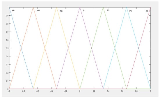 The MAS had two input signals, which were the error and the derivative of error. These signals defined the global state of the MAS. The MAS consisted of three agents, each one for one gain of the PID controller. There were the agent, the agent, and the which were dedicated to adjust the gains , and respectively. The input signals were conditioning in the range of {−1, 1} and, through the fuzzy approximator, defined the current states of the MAS. The membership functions for each state variable (for both inputs) were seven (Figure 4). The quantization of the inputs in the seven areas, with 50% overlapping, provided enough details in order to cover the range of each input. In addition to that, the state space remained small (two inputs with seven MFs each results in a total of 49 states) and was easy to explore. These states were represented by an equal number of fuzzy rules and, consequently, the MAS could simultaneously be from one state to four (each state had each firing strength). The NB, NM, NS, Z, PS, PM, and PB denote Negative Big, Negative Medium, Negative Small, Zero, Positive Small, Positive Medium, and Positive Big, respectively.