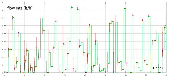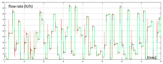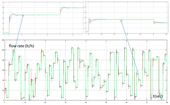 Water flow rate with PID controller tuned by Z–N (blue line), water flow rate with fuzzy Q-learning MAS PID controller (red line), and set point of water flow rate (green line) for scenario 2.