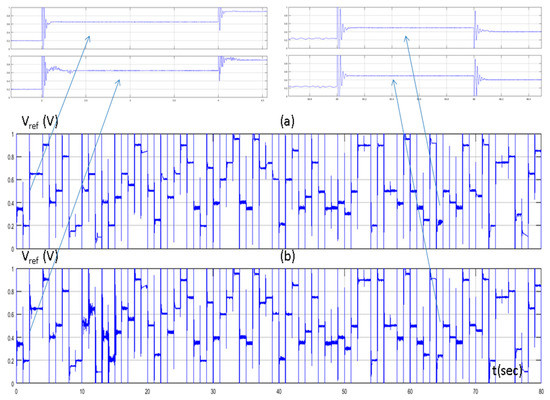 (a) Reference voltage of PID controller tuned by Z–N; and (b) reference voltage of fuzzy Q-learning MAS PID controller.