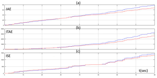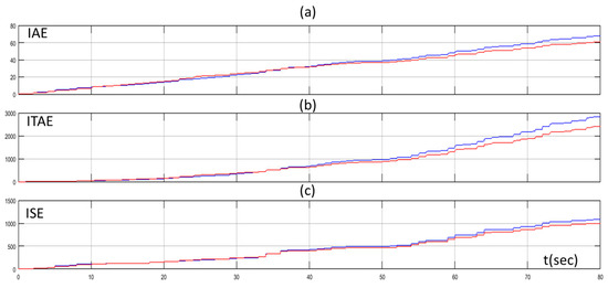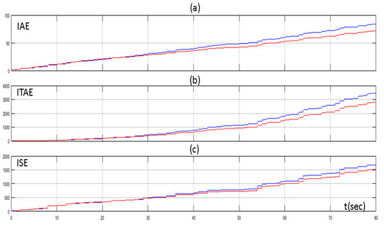 The improvement of the performance of the proposed method was highlighted in Figure 8, where the values of the Integral Absolute Error (IAE), the Integral Time Absolute Error (ITAE), and the Integral Square Error (ISE) through time are presented. The IAE, the ITAE, and the ISE are defined as below: