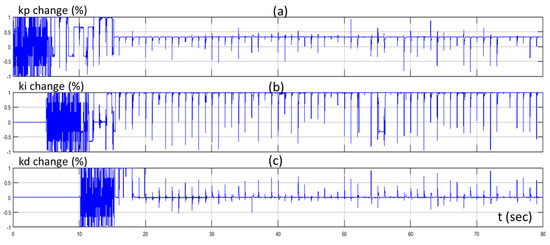 Percentage change of (a) proportional gain (kp); (b) integral gain (ki); and (c) derivative gain (kd) through time.