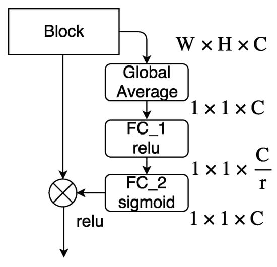 In Figure 2, we show how SE module operates with an existing block. Let us assume the output tensor is A and the shape of A is . Then, the global average operation maps each feature map into one value by calculating the average on each feature map.