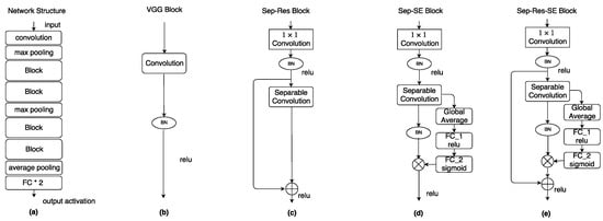 We show the structure of our neural network in (a). The first convolution layer extracts information from input data and the two fully connected layers at the bottom gradually change the output size to class number. There are four blocks in the main body of the network; we can put different settings in all those four blocks to see how to design network can perform better. (b) is a standard VGG Block, a convolution followed by batch normalization and relu. (c) is a Sep-Res Block, we replace standard convolution with separable depthwise convolution and add residual learning module on it. The first convolution increase channels to guarantee the output shape is the same as input shape for residual. (d) is a Sep-SE Block, we replace the residual learning module by squeeze-and-excitation module. In (e), we combine all those parts together to form Sep-Res-SE Block.