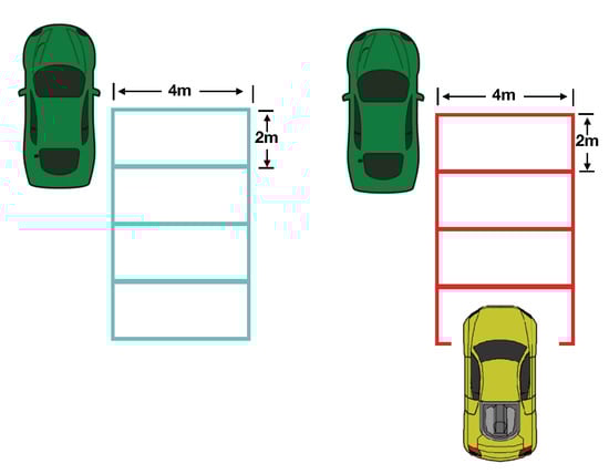 In this subsection, we discuss the procedures to transform the blind spot detection to a machine learning problem. We draw the blind spot region in Figure 4. The region consists with four 4 m × 2 m rectangles. Driver should be alerted if any car enters this region. So we model blind spot detection as a Car or No-Car two-class classification problem. No-Car class indicates there is no vehicle in the blind spot region, so it is safe for lane changing. Car class means there is at least part of a vehicle in the blind spot region, thus driver should not change lanes. Our test vehicle is a Lincoln MKZ equipped with high-resolution Sekonix cameras. We mount the blind spot camera on the side of rooftop with 45 degrees facing backward, and the position of blind spot camera is shown in Figure 5a. In order to capture information better, we create a 3D region with 2 m in height recorded by camera in Figure 5b. Before feeding the training image into models, we preprocess original image by clipping the blind spot region and resize it to . Figure 5c is the input image of Figure 5b after preprocessing.