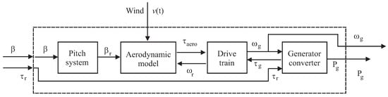 First, this work proposes a horizontal-axis wind turbine device, as nowadays it represents the most common type of solution for large-scale deployments. Moreover, this three-bladed wind turbine follows the principle that the wind power activates its blades, thus producing the rotation of the low speed rotor shaft. This rotational speed required by the electric generator is increased via a gear-box with a drive-train []. The schematic diagram of this benchmark that helps to recall its main variables and function blocks developed in the Simulink environment is depicted in Figure 1.