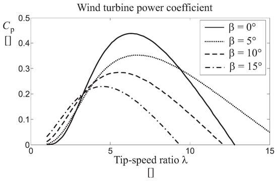 being air density, A the area swept by the turbine blades during their rotation, whilst is the tip-speed ratio. The nonlinear relations of Equation (1) is represented in Figure 2, which is also depicted for different values of .