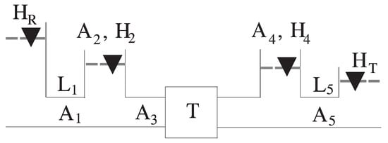 On the other hand, the hydroelectric plant considered in this work consists of a high water head and a long penstock, which also includes upstream and downstream surge tanks, with a Francis hydraulic turbine [], as recalled in Figure 3. Therefore, the hydroelectric simulator consists of a reservoir with water level , an upstream water tunnel with cross-section area and length , an upstream surge tank with cross-section area and water level of appropriate dimensions. A downstream surge tank with cross-section area and water level follows, ending with a downstream tail water tunnel of cross-section area and length . Moreover, between the Francis hydraulic turbine and the two surge tanks, there is a penstock with cross-section area and length . Finally, Figure 3 highlights a tail water lake with level . The levels and of the reservoir and the lake water, respectively, are assumed to be constants.