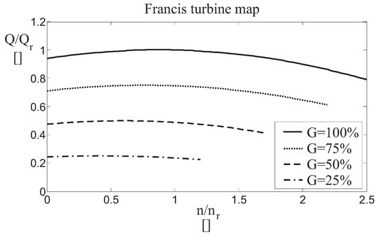 Moreover, the relation of Equation (4) includes the wicked gate opening, described by the non-dimensional parameter G, varying from 0 to . As an example, Figure 4 represents the function of Equation (4) for different values of the wicked gate opening G, which defines the operating conditions of the Francis hydraulic turbine.