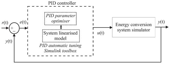 with , , being the PID proportional, integral, and derivative gains, respectively. The most common strategy exploited for the computation of the parameters of the PID governor relies on the relations of Ziegler–Nichols []. However, with the development of relatively recent automatic software routines, the optimal parameters of the PID regulator can be easily determined by means of the tuning algorithm implemented in the Simulink environment. This strategy requires the implementation of the controlled process by means of the Simulink functional blocks, since it tries to optimise the input–output performances of the monitored system in terms of response time and stability margins (robustness) []. In particular, the automatic tuning procedure implemented by the PID Simulink block performs the computation of the linearised model of the energy conversion systems studied in this paper. The logic scheme of this procedure is sketched in Figure 5.