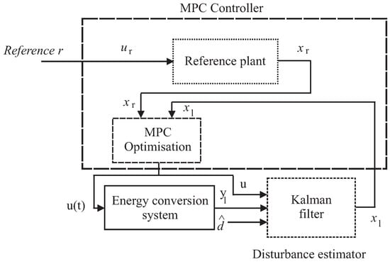 The proposed technique leads to a nonlinear MPC problem that includes the nominal model of the considered energy conversion system of Equation (17), the estimator of the disturbance d, and the Kalman filter of Equation (18) as predictor. The local observability of the model of Equation (17) is essential for state estimation, which is easily verified. The implementation of the proposed disturbance compensation strategy has been integrated into the MPC Toolbox of the Simulink environment.