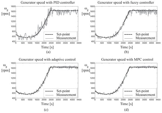 In particular, the values in Table 1 highlight that the fuzzy controllers lead to better performances than the PID regulators with self-tuning features. This is motivated by the flexibility and the generalisation capabilities of the fuzzy tool, and in particular the FMID toolbox proposed in []. Better results are obtained by means of the adaptive solution, due to its inherent adaptation mechanism, which allows for tracking the reference signal in the different working conditions of the wind turbine process. However, the MPC technique with disturbance decoupling has achieved the best results, as reported in Table 1, since it is able to optimise the overall control law over the operating conditions of the system, by taking into account future operating situations of its behaviour, while compensating the disturbance effects.