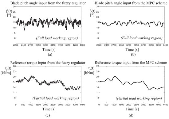 Wind turbine inputs (a,c) from the fuzzy control strategy and (b,d) by the MPC scheme.