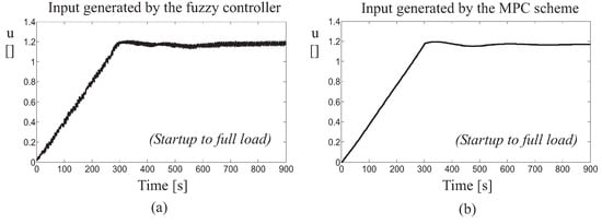 Hydroelectric plant input u generated (a) by the fuzzy controller and (b) from the MPC approach.
