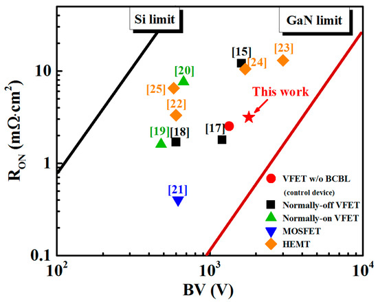 - Li, R.; Cao, Y.; Chen, M.; Chu, R. 600 V/1.7 Ω Normally-Off GaN Vertical Trench Metal–Oxide–Semiconductor Field-Effect Transistor. IEEE Electron Device Lett. 2016, 37, 1466–1469. [Google Scholar] [CrossRef]