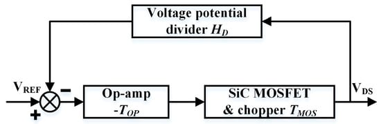 Most power converters can be reduced to the standard chopper cell to investigate the transient response of power MOSFETs/IGBTs. Therefore, a standard chopper cell was chosen for the illustration of the drive circuit modeling. Figure 1 shows the chopper in detail, including a freewheeling diode, an inductive load, a power MOSFET, and the closed-loop gate drive. The drive circuit followed the same structural outline with that proposed in []. A feedback control was used to modify the drain-source voltage according to the reference waveform. The drain voltage feedback formed with resistors and capacitors was applied to provide a scaled drain voltage. An op-amp with a high bandwidth and a wide voltage swing was applied to obtain the error signal by comparing the scaled drain voltage with the reference waveform. The drive stage was an emitter follower formed with two transistors and provided the necessary current gain for MOSFET driving. The gate resistor Rg played an important role in stability control.