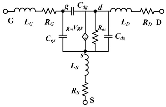 A small-signal MOSFET model, as shown in Figure 3, takes into account the internal gate resistance RG, source resistance RS, drain resistance RD, output resistance Rds, the terminal stray inductances LG, LS, LD, the drain-source Cds, drain-gate Cdg, and gate-source Cgs capacitances, as well as the transconductance gm. In the following analysis, RG should consist of both the external and internal gate resistances. Additionally, the terminal stray inductances should include the drive circuit stray inductances. The small-signal conditions are different for the turn-on and turn-off process []. In this study, we illustrated the stability investigation based on the turn-off process. The same analysis procedure can be performed for the turn-on process.