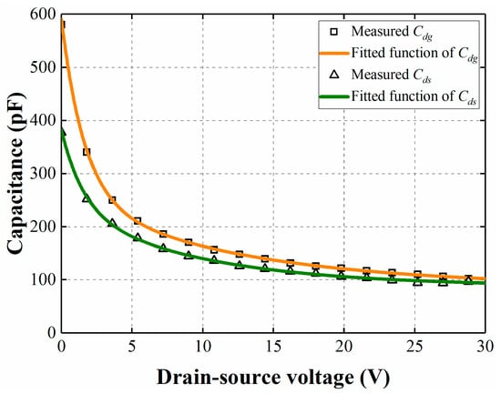where the drain-source voltage VDS increases from 0 to 30 V according to (10). The measured nonlinear capacitances and the fitted functions are shown in Figure 4.