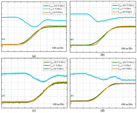 Turn-off switching transient waveforms of power MOSFET: (a) VDS, VREF, and VGS waveforms under Design I; (b) VDS, VREF, and VGS waveforms under Design II; (c) VDS, VREF, and VGS waveforms under Design III; (d) VDS, VREF, and VGS waveforms under Design IV.