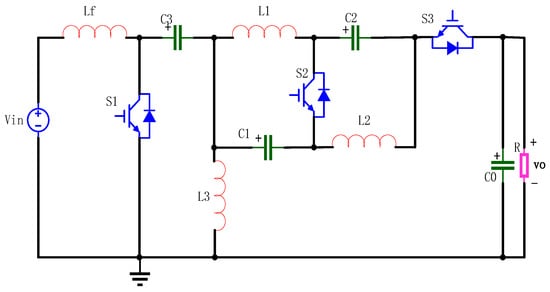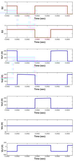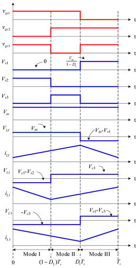 According to the above analysis, it is easy to get the key theoretical waveforms of the proposed topology, as shown in Figure 3. The values , , and are the switching statuses of switches S1, S2, and S3, respectively. The values Vs1, Vs2, and Vs3 are the voltages of switches S1, S2, and S3. When the switch is turned on, the voltage of the switch will be equal to zero. In contrast, there will be voltage in the switch when it is turned off and the value of voltage is equal to Vin(1 + k), based on Equation (16). Furthermore, VLf, VL1, and VL3 are the voltages of inductors Lf, L1, and L3, respectively. According to the operation modes in Figure 2, when D1 is at a high level, Lf is magnetized by Vin, so VLf = Vin. When D1 is at a low level, according to the loop analysis, VLf = Vin − Vs1. As for VL1 and VL3, the same analysis method is applied and the value is shown in Figure 3. Similarly, iLf, iL1, and iL3 represent the inductors’ currents and they are changed following their voltage.