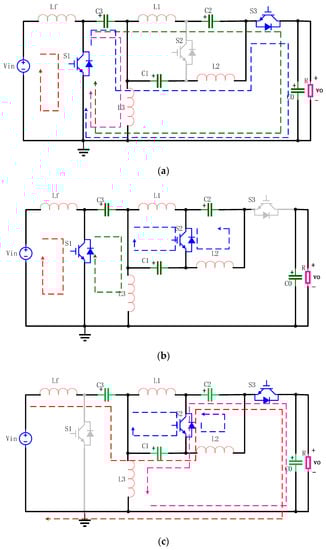 The operation modes are discussed as follows: In mode I, as shown in Figure 2a, switch S1 and switch S3 are on, whereas switch S2 is off. The inductor, Lf, is magnetized by input voltage Vin, and capacitors C1, C2, and C3 are charged. According to Kirchhoff’s law of voltage and current, the expression of this mode is shown in Equations (1) and (2). In mode II, switch S3 is off and switches S1 and S2 are on, as shown in Figure 2b. The inductor, Lf, is magnetized by input voltage , and capacitors C1, C2, and C3 are discharged. Equations (3) and (4) show the expression of mode II. In mode III, switches S2 and S3 are turned on while switch S1 is turned off, as depicted in Figure 2c. Capacitors C1, C2, and C3 are charged. The equations of this mode are expressed as shown in Equations (5) and (6). In Figure 2, the dashed line direction represents the current direction of the inductors.