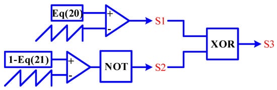 Figure 4 shows the control diagram of the proposed inverter. The result of Equation (20) is a constant, it is then compared with the carrier signal to produce the switch S1 pulse, which is used to boost the input voltage. However, the result of Equation (21) is a sinusoidal variable. The driven signal of switch S2 is generated by comparing the resulting varying duty cycle with the carrier signal, which generates a sinusoidal output. According to the operation modes, only two switches are turned on at the same time. Therefore, the pulse of switch S3 can be determined by the driven signal of switches S1 and S2. The pulse of switch S3 is obtained by the XOR gate. Through the XOR gate, it is guaranteed that only two switches are turned on at a time.