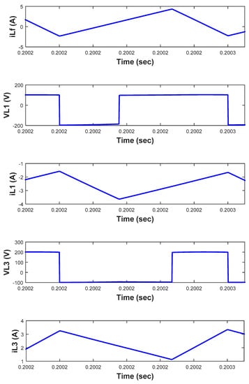 where denotes the input voltage; , , , and are the voltage of capacitors C0, C1, C2, and C3; and , , and are the current of capacitors C1, C2, and C3. Similarly, , , , and are the voltage of inductors L1, L2, L3, and input inductor Lf, and , , and are the current of inductors L1, L2, and L3. is the output current.