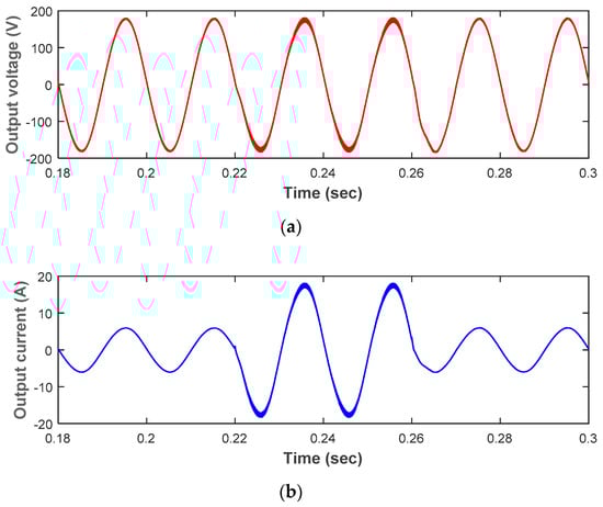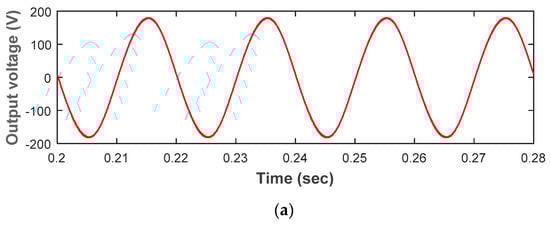 The proposed inverter, under resistive load, was simulated in MATLAB/Simulink, assuming the current ripple of all inductors was calculated by . Similarly, was used to calculate the voltage ripple of all capacitors. Therefore, based on Equations (7)–(15), the value of inductors and capacitors could be calculated as shown in Table 1. Considering the laboratory conditions, in order to experiment conveniently, the switches were IGBT and the switching frequency, fs, was 20 kHz. The output of the simulation was 124 V, 50 Hz under the condition of 100 V input voltage.