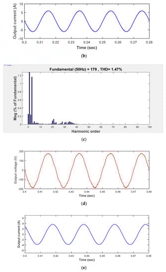 Input voltage at 100 V and load at 30 Ω for SEPIC-based ZSI: (a) load voltage, (b) load current, (c) Fast Fourier transform (FFT) analysis, (d) output voltage with inductive load, and (e) output current with inductive load.