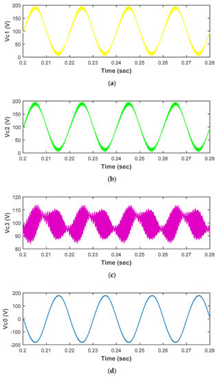 Input voltage at 100 V and load at 30 Ω for SEPIC-based ZSI. Voltage wave of (a) capacitor C1, (b) capacitor C2, (c) capacitor C3, and (d) capacitor C0.