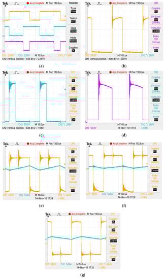 Experimental waveforms: (a) driven signal of the switches; (b) the voltage of switch S1 (CH1: Time (10 µs/div), Vs1 (50 V/div)); (c) the voltage of switch S2 (CH2: Time (10 µs/div), Vs2 (50 V/div)); (d) the voltage of switch S3 (CH3: Time (10 µs/div), Vs3 (50 V/div)); (e) the voltage and current of inductor Lf (CH1: Time (10 µs/div), VLf (50 V/div), CH2: Time (10 µs/div), iLf (5 A/div)); (f) the voltage and current of inductor L1 (CH1: Time (10 µs/div), VL1 (50 V/div)), CH2: Time (10 µs/div), iL1 (5 A/div)); and (g) the voltage and current of inductor L3 (CH1: Time (10 µs/div), VL3 (50 V/div), CH2: Time (10 µs/div), iL3 (5 A/div)).