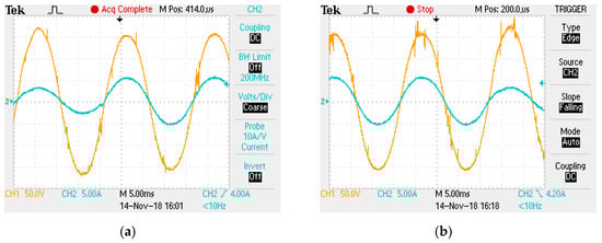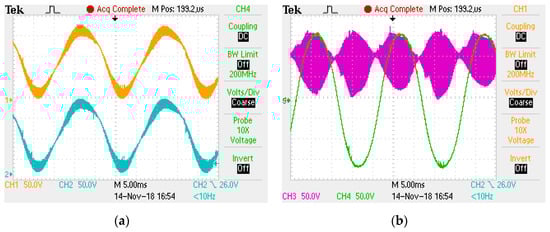 (50 V/div)); (b) (CH3: Time (5 ms/div), (50 V/div)) and (CH4: Time (5 ms/div), (50 V/div)).