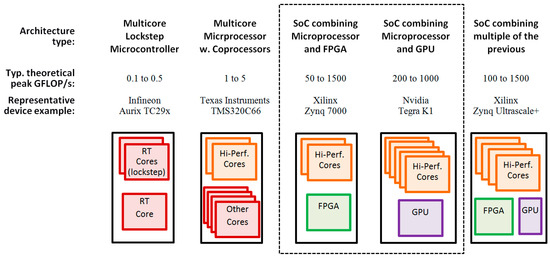 Application oriented microprocessors provide typically higher clock frequencies and more cores than microcontrollers, often even with notable 64 bit processing capabilities providing faster double precision floating point operations. They represent a powerful solution for a wide variety of demanding applications but unless combined with elaborate software solutions or some other elements—e.g., real-time co-processing cores and certain integrity mechanisms- their suitability for safety-critical real-time control functions is rather limited. Equally to the microcontrollers, their sequential code execution paradigm only is capable of providing limited parallelism [29,30].
