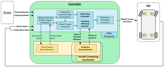 As described in the previous Section 3, the torque of four independent motors needs to be controlled in order to optimize not only the handling but also the efficiency, the thermal load and the smoothness of operation, all of which depends on different input variables. This means that it is not only a multi-objective optimization problem but also a MIMO (multiple input multiple output) system.