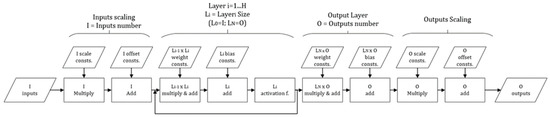 As illustrated in the flow chart in Figure 5, once the input signals are received, they need to be scaled to normalized values, before the execution of the actual NN can start with the hidden layers. For each hidden layer, each of its neurons needs to apply a weight to each of the signals from the previous layer (or the inputs, in the case of the first layer) and calculate the resulting sum. This can be represented as a multiplication of a vector with a matrix and can be also implemented as dot products. Having the intermediate results of the previous layer, the bias values are added to each output. The final output of the layer is obtained after applying the activation function for each neuron. This process is repeated for each hidden layer, until reaching the output layer. This last layer does not have an activation function and will provide the results to be scaled to get the actual NN outputs.