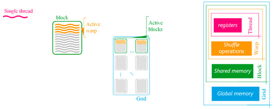 For the developments presented along this paper, we exploit CUDA, a parallel computing platform and programming model created by NVIDIA [75]. In this environment and as is illustrated in Figure 6, heterogeneous programming is performed by having one host processor in charge of launching the execution of the parallel workloads on the GPU. Each program executed on the GPU is referred to as a kernel. Parallel execution of all threads in a kernel is structured as a grid of blocks, each block containing several threads, which are actually synchronously executed in several smaller sets called warps. Memory and communication among all the threads of a kernel are also structured following the same hierarchy (illustrated on the right side of Figure 6). Each thread has exclusive access to its registers but it is able to share its registers within all the threads of the same warp by means of shuffle operations. Within each block, threads can exchange information via shared memory, whereas the much slower global memory must be used for the wider scope of the grid level [75].