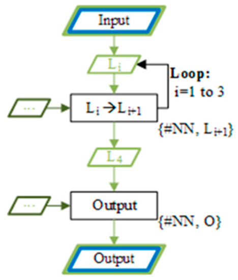 Flow chart of the generalized version of the implemented neural network inference algorithm, indicating the dimensions of the data and the amount of operation.