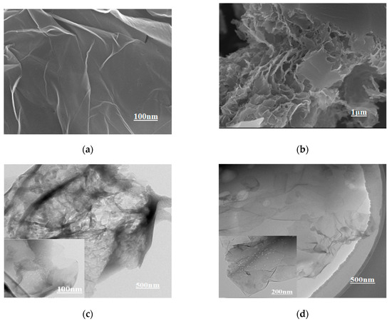 We analyzed P-PCG material by studying crucial factors, for example, morphologies, surface functional groups, surface area and pore size. Figure 1 presents the scanning electron microscope (SEM) and transmission electron microscope (TEM) pictures of P-PCG composite. It is observed that graphene sheets with few layer folded and twisted type exist in P-PCG composite. The images in Figure 1b,c indicate that there are lots of laminated structure of graphene nano-sheets and carbon particles existing in P-PCG, which make a substantial contribution to high specific capacitance. Also, Figure 1a,d show that P-PCG possesses large transparent graphene nano-sheets with rumpled and pleated features and lots of open edge sites being twisted and scrolled. The rumples might initiate from P defects and the structural alteration originated by the upturn of bond length and declined of bond angles when P atoms were integrated into graphene nano-sheets, relieving carbon atoms. Because of the above reasons, P-PCG composite possesses pseudo-capacitive active sites and ion transport channel, which are demonstrated to enhance the capability of electrical energy storage for supercapacitors [21,22,23,24].