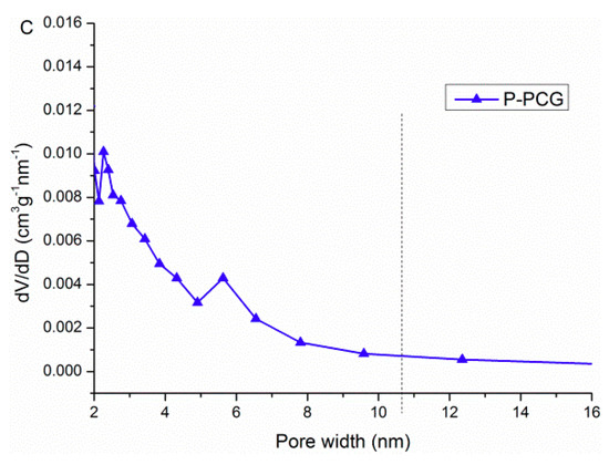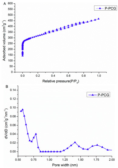 (A) Adsorption/desorption isotherms of N2; (B) micropore distribution of P-PCG by Density Functional Theory (DFT) method; (C) mesopore distribution of P-PCG by Barrett Joyner Halenda (BJH) method.