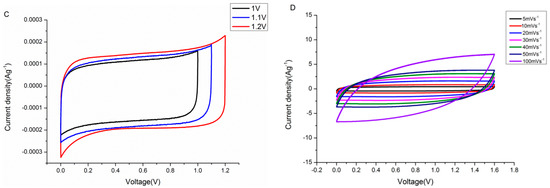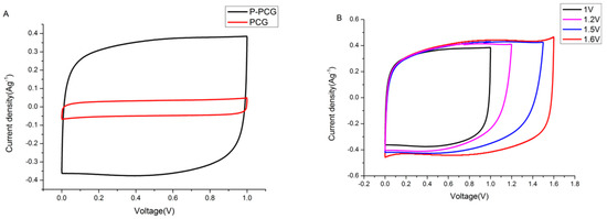 (A) Cyclic voltammetry (CV) curves of P-PCG and PCG at a scan rate of 5 mVs−1 with window voltage of 1 V; (B) P-PCG electrodes with cut-off voltages from 1 V to 1.6 V at scan rate of 5 mVs−1; (C) porous carbon/graphene (PCG) electrodes with cut-off voltages from 1 V to 1.2 V at scan rate of 5 mVs−1; (D) CV curves of P-PCG at various scan rates from 5 to 100 mVs−1.
