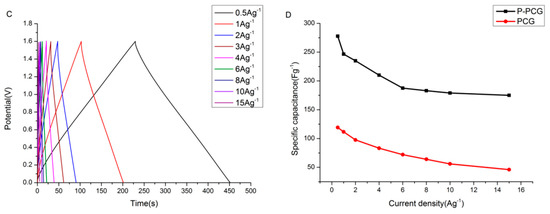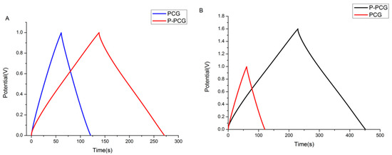 In order to further evaluate the capacitance property, Galvanostatic charge–discharge (GC) profiles within the potential range of 0–1.0 V were performed. As shown in Figure 5A, GC curves of P-PCG and PCG were performed at a current density of 0.5 Ag−1, exhibiting triangular shape. GC curves are highly linear and symmetrically close to triangle shapes, demonstrating ideal capacitor behavior. It is obvious that P-PCG shows a longer discharge time than that of PCG, thus yielding higher specific capacitance. Because of the presence of pseudo-capacitance in P-doped porous carbon/graphene electrodes, which becomes the additional mechanism of energy storage alongside of double-layer formation, the P-doped electrodes shows higher capacitance than undoped counterpart.