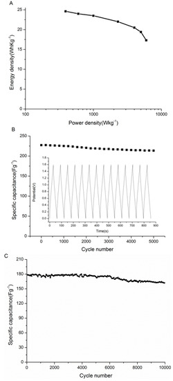 The energy density is related to the cell capacitance and the square of the operating voltage. Therefore, because of the wide potential range, the energy densities of P-doped porous carbon/graphene are increased significantly compared with the value of undoped porous carbon/graphene. The Ragone plot of the P-PCG is shown in Figure 6A. The maximum energy density of 26.42 Wh/kg with a power density of 390 W/kg and power density of 6 kW/kg with energy density of 17.3 Wh/kg were achieved.